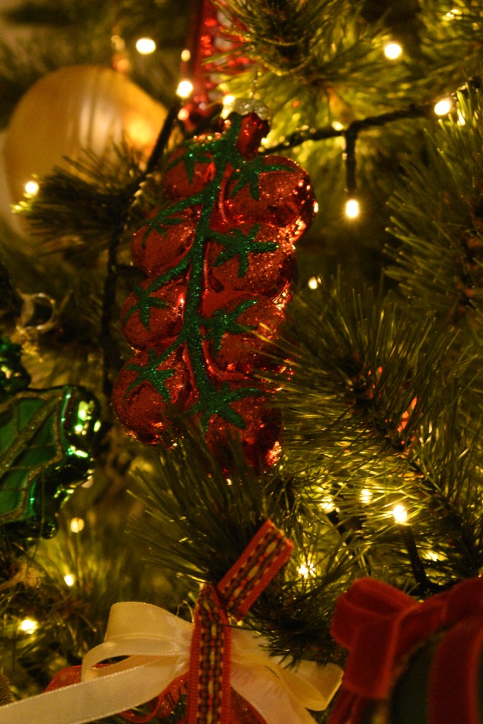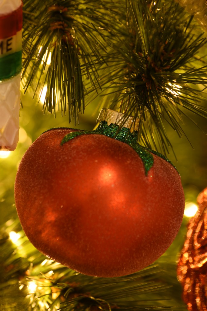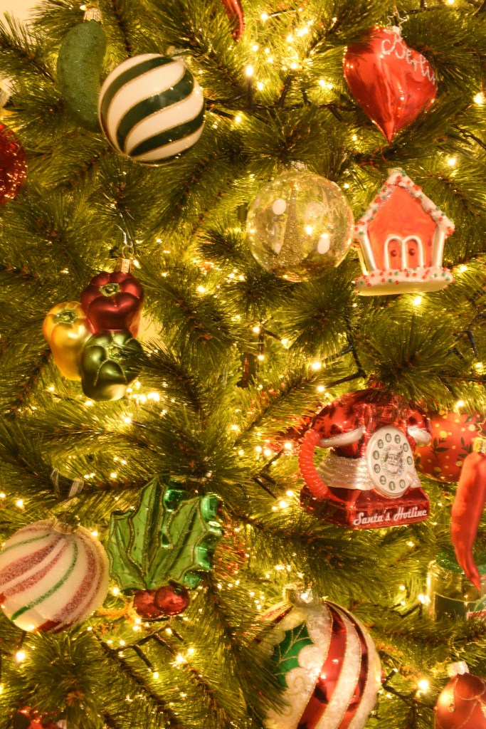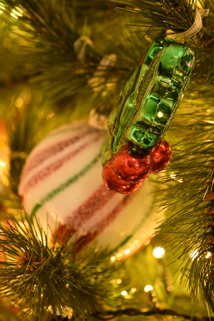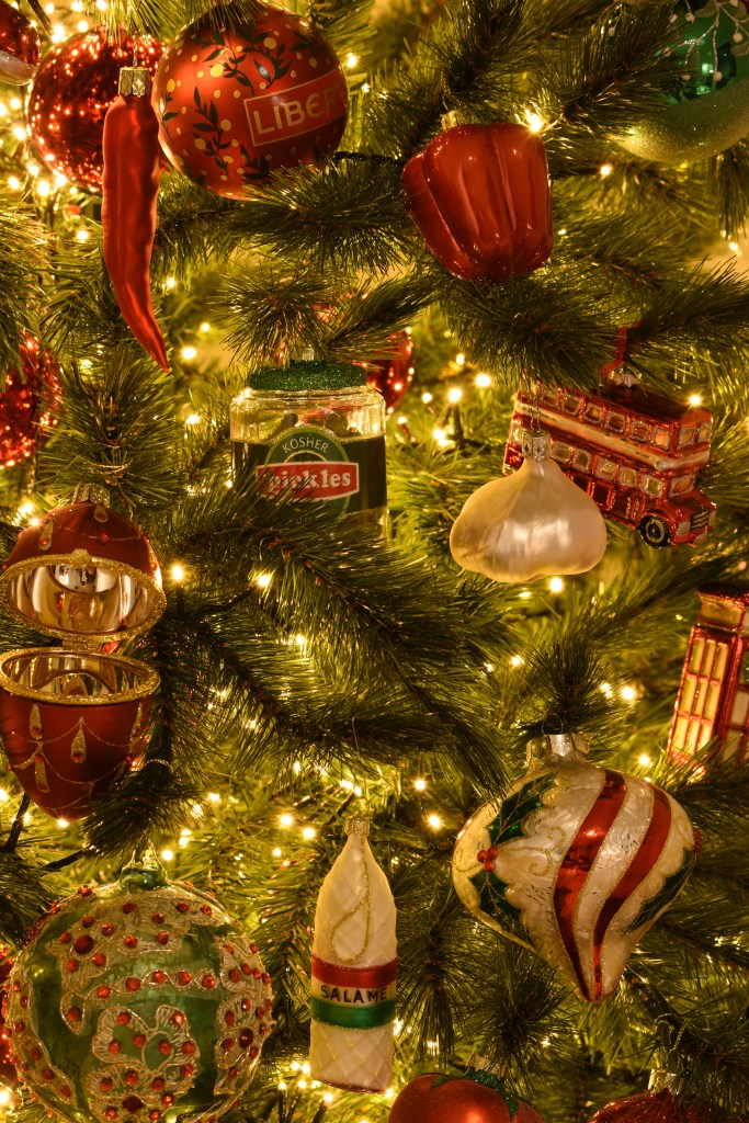 Toevallig reisden we het afgelopen jaar maar liefst drie keer naar een land met groen, rood en wit in de kleuren van de vlag: Hongarije, Bulgarije en Italië. Dé perfecte kerstkleuren als je ’t mij vraagt. En de Balkan? Dat is veel ajuin, augurken, pepers, paprika’s, look en tomaten. De ijspegels in deze boom zijn dan ook vervangen door … rode pepers en augurken in alle geuren en kleuren. Goed nieuws voor mijn collectie kerstaugurken die ik eindelijk nog eens kon bovenhalen! 😊