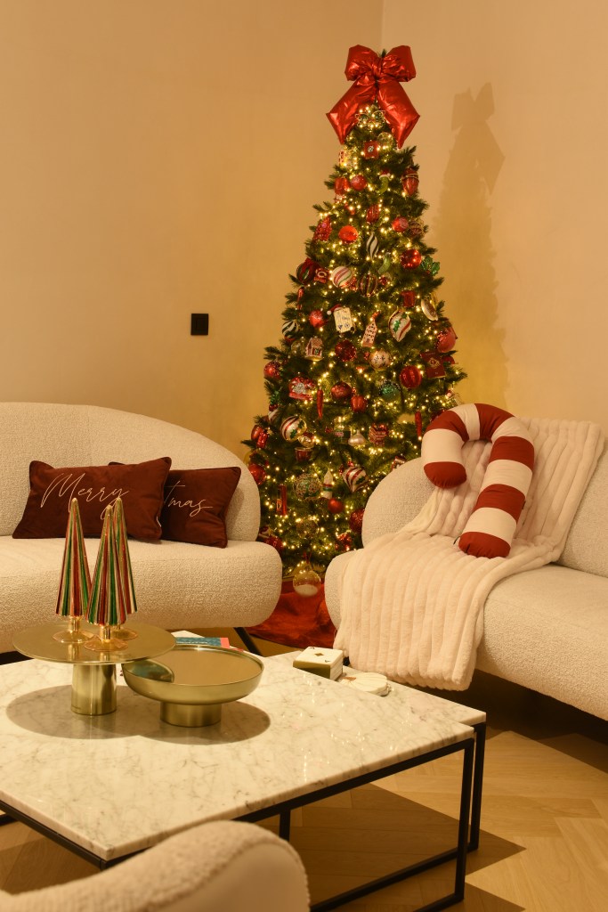 Jaarlijks is deze boom een beetje de hoofdrolspeler in ons kerstdecor. Het is onze belangrijkste boom (en stiekem ook onze lievelings) omdat we er tenslotte elke avond op zitten te kijken. Elk jaar krijgt deze boom dan ook de meeste aandacht, de meeste lichtjes en de meeste diepte. Wat ik daarmee bedoel? Deze boom is zelfs tot tegen de stam gedecoreerd met glanzende ballen die de honderden lichtjes nog eens zo hard doen weerkaatsen. Stop je neus gerust eens tussen de takken om het van naderbij te inspecteren!
