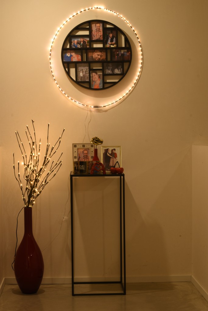 De plaats van deze boom is niet toevallig gekozen. Recht tegenover de boom, aan de spreekwoordelijke ‘overkant’, kijken de 13 dierbaren die ons al hebben verlaten mee naar ‘hun’ kerstboom. Het is een sereen plekje met een altaar, een vaas met lichtjes en een ronde fotokader met de 13 dierbaren die niet meer bij ons zijn. Zelfs niet iedereen past erin … er staan nog meer fotootjes op het altaar. Als je aan mijn bureau (Valerie) zit, zie je op de achtergrond van de foto van mijn vader dezelfde vaas met lichtjes staan als aan de overkant. En achter de boom, komen ook de kaartsymbolen terug (zie Together again).