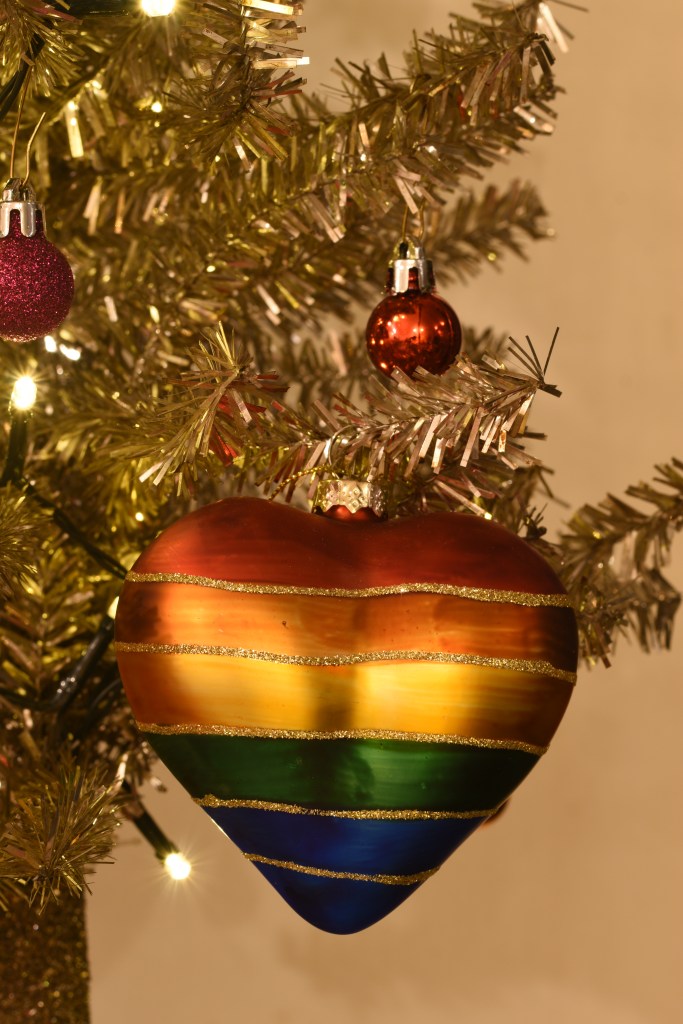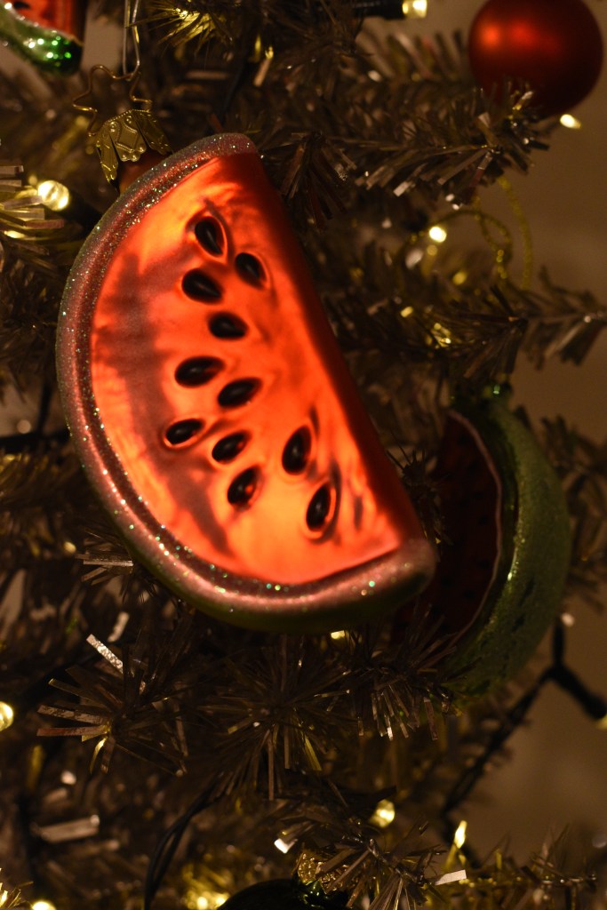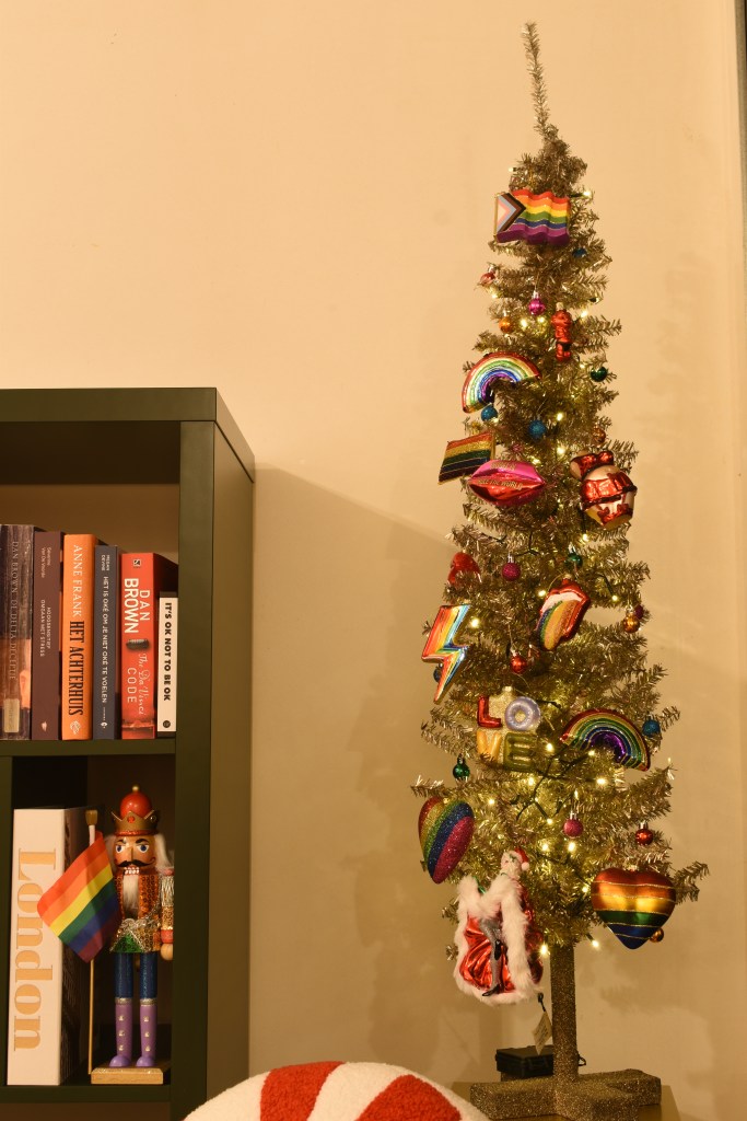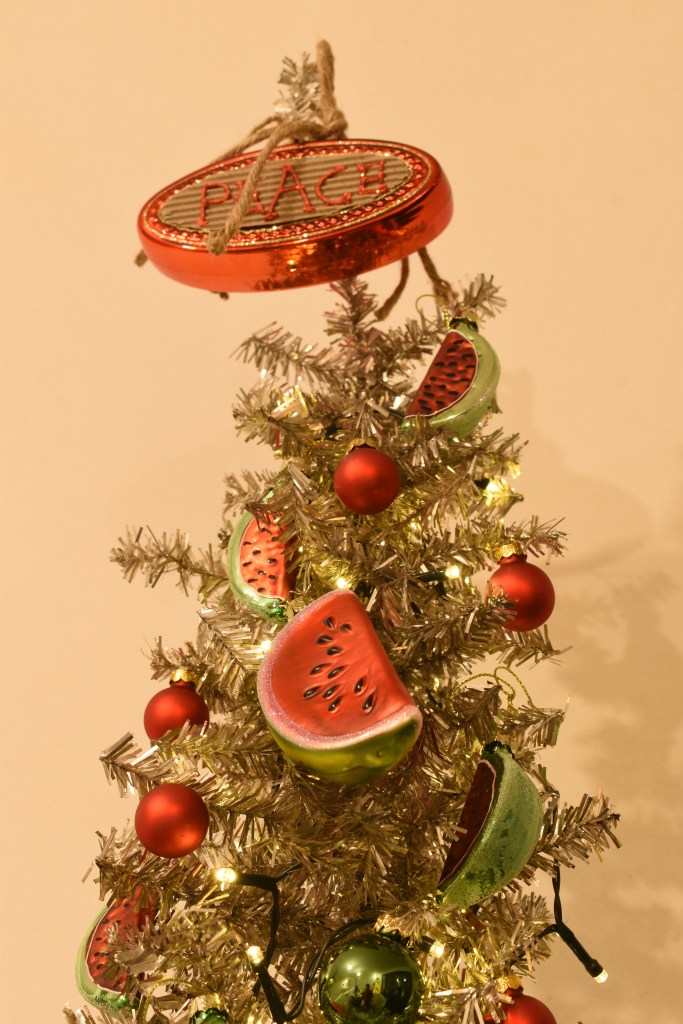 Dit jaar wilden we met kerst ook een statement maken. Op de barricade staan, vanop afstand dan tenminste, met symbolen van onrecht in de wereld: watermeloenen voor de genocide in Gaza, maar ook in Oost-Congo, Soedan … Ook voor de LGBTQIA+-rechten die steeds meer teruggedrongen worden, blijven we onze mond opentrekken. Het is nog steeds nodig.